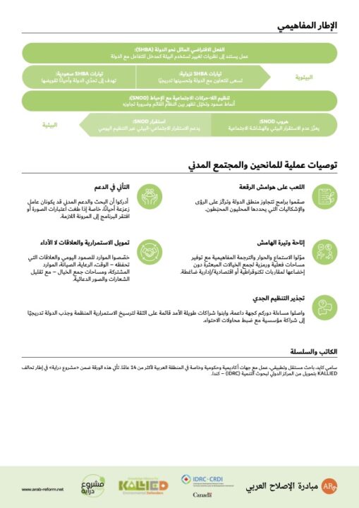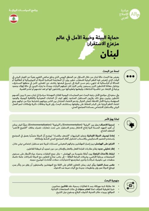 تستكشف هذه الدراسة السياسة البيئية كمفهوم وممارسة معاصرة في لبنان، عبر تتبّع كيفية تموضع الجهات الفاعلة في علاقتها مع الدولة عند التنقل بين التغيير والتخلي وحتمية الاستمرار. وترى الدراسة أن البيئة ناشئة عن التحوّل الاجتماعي-الإيكولوجي، ومختلفة جوهريًا عن البيئة التي تنشأ من إعادة الإنتاج داخل النظام الحالي – أي الأشكال المعاصرة للرأسمالية النيوليبرالية الحالية والعقلية اليومية السائدة التي تتعامل معها باعتبارها الطريقة الأكثر منطقية للعيش. يقوم النظام الحالي في لبنان حول شكل طائفي من الرأسمالية النيوليبرالية المتوحشة – التي تتسم بمفارقات محيرة مثل مناصرة الأسواق الحرة وتشكيلها بطريقة انتقائية لخدمة السلطة الراسخة. وتسلط الدراسة الضوء على كيفية بروز السياسة ما قبل الليبرالية – أي تشريع المستقبل المرغوب فيه من خلال تلبية الاحتياجات المادية اليومية للاستمرار – من الهوامش السياسية اللبنانية التي يمكن أن تفسح المجال أمام السياسة البيئية.