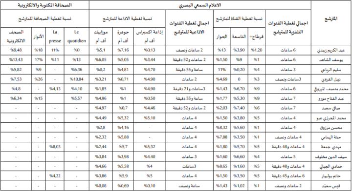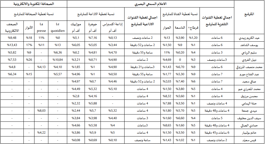 وبالعودة إلى تقرير محكمة المحاسبات الخاص بمراقبة الأحزاب وتمويل الحملات الانتخابية الرئاسية المبكرة الصادر في 8 نوفمبر/تشرين الثاني 2020، والنظر إلى ترتيب المرشحين من حيث التغطية الإعلامية، نلاحظ أن قيس سعيد صُنّف في المرتبة الأخيرة من المرشحين الذين حصلوا على تغطية إعلامية في القنوات التلفزية والإذاعات والجرائد.