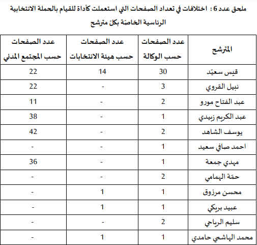 في المقابل - ومن خلال التقرير نفسه - نجد أن قيس سعيد حصل على المرتبة الأولى كأكثر مرشح حصل على دعاية إعلامية خلال الحملة الانتخابية من خلال صفحات فايسبوكية، حيث ساهمت 30 صفحة غير رسمية في خدمة الحملة الانتخابية لقيس سعيد بمجموع 3 ملايين مشترك، أدارها 85 مشرفاً مقيمين في تونس وفي عدد من بلدان العالم.