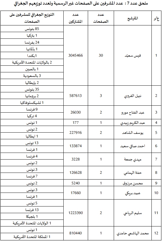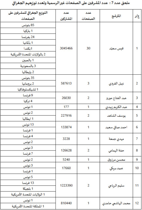 وتجدر الإشارة أيضاً إلى أن تقرير محكمة المحاسبات تناول فقط صفحات الفايسبوك التي ساهمت في الدعاية لقيس سعيد، ولكنه أغفل المجموعات التي أنشئت على مواقع التواصل الاجتماعي مثل مجموعة "الشعب يريد" و"احنا ماكينة" والتي نجحت في استقطاب أعداد مهولة من الناخبين خاصة الناخبين الشبان منهم.