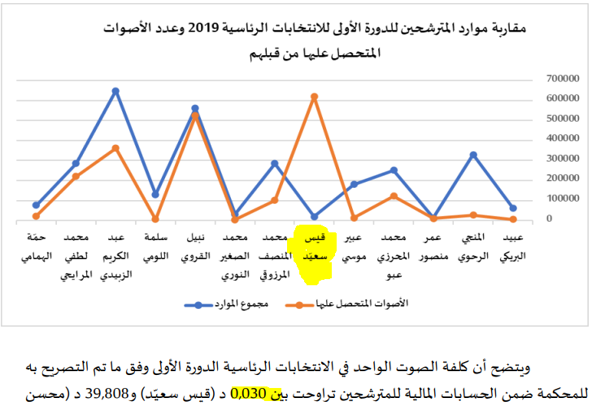 وبحساب مجموع الأصوات التي حصل عليها مقارنة بتكلفة الحملة الانتخابية، فإن تكلفة الصوت بالنسبة لقيس سعيد لم تتجاوز 0.030 دينار، وهي أقل تكلفة بين المرشحين وأدنى بكثير من متوسط التكلفة لدى كل المرشحين التي تمثل 1.980 ديناراً.