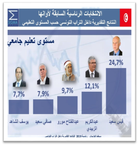 وبناء على إحصائيات مؤسسة سيغما كونساي تمكن قيس سعيد من حصد 25 بالمئة من أصوات ذوي التعليم العالي كأكثر مرشح منتخب من قبل الجامعيين.