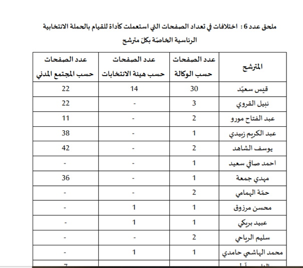 اختلافات في تعداد الصفحات التي استعملت كأداة للقيام بالحملة الرئاسية الخاصة بكل مرشّح، تقرير محكمة المحاسبات الخاص بمراقبة الأحزاب وتمويل الحملات الانتخابية للانتخابات الرئاسية السابقة لأوانها الصادر في نوفمبر / تشرين الثاني.