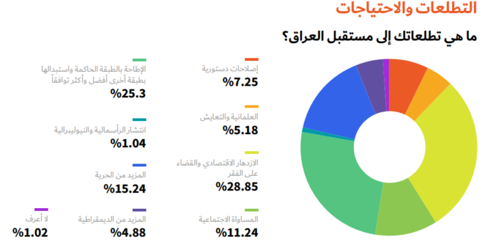أظهر الشباب الذين شملهم الاستطلاع لامبالاة تجاه المشاركة السياسة الرسمية، وخوفاً من الانخراط في العمل السياسي أو التعبير عن الآراء/الانتماءات السياسية بسبب مخاوف أمنية. 39٪ منهم أكدوا أن الصراع جعلهم يمتنعون عن المشاركة في أي شكل من أشكال المشاركة السياسية. ومع ذلك، يعتقد 78٪ من الشباب الذين شملهم الاستطلاع أن العمل الجماعي مهم/مهم للغاية؛ وهناك 82٪ ممن شملهم الاستطلاع لا يدعمون/لا يؤيدون الجماعات المسلحة/العسكرية باعتبارها شكلاً من أشكال العمل الجماعي؛ ويعتقد 78٪ من الشباب الذين شملهم الاستطلاع أن الصراع جعل جميع المجموعات العرقية والطائفية في وضع أسوأ وليس فقط جماعتهم. وهناك 34٪ ممن شملهم الاستطلاع لا يؤمنون بنزاهة الانتخابات في العراق و43٪ منهم لا يؤمنون بقدرة الانتخابات (القادمة) على إحداث تغيير إيجابي. كما أن 60٪ ممن شملهم الاستطلاع يؤيدون علمنة العراق، فيما يؤيد القليل منهم الطائفية. ويعكس هذا الاستعراض السريع للنتائج وجود جيل ذي صبغة تقدمية من الشباب في العراق، ويتطلع هذا الجيل إلى شكل من أشكال التجديد الوطني وإعادة التفكير في أسس الدولة القومية.