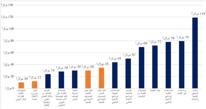 - كلفة اقتصادية أقل: ويعود ذلك إلى كونها أرخص وتكاليفها التشغيلية البشرية واللوجستية والفنية أقل، وحتى التمويل الرابع لخطة الاستجابة والثالث للبرنامج، بلغت تكلفة البرنامج 440 مليون دولار، مثلت النفقات الإدارية 10% منها فقط، وهذا ما ليس عليه الحال مع بقية أنواع المساعدات، (انظر رسم توضيحي 3).