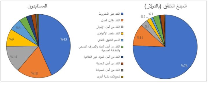 تأخذ التحويلات النقدية ثلاثة أشكال مختلفة (التحويلات غير المشروطة، والنقد مقابل العمل، والقسائم). هناك إقرار واسع النطاق بأن الحوالات النقدية غير المشروطة تعتبر واحدة من أكثر شبكات الضمان الاجتماعي فاعلية في أوقات النزاع والاستجابة لتداعياته. وقد طبقت المساعدات النقدية في مناطق أخرى عانت من الصراع مثل العراق. وتختلف برامج التحويلات النقدية غير المشروطة باختلاف السياق المطروح، وتؤدي دوراً مكملاً أو بديلاً للمساعدة العينية، وتسمح بتحقيق أهداف محددة في سياقات معينة. ولها مزاياها العديدة مثل: السرعة والفعالية والكلفة الأقل، والمرونة فهي تضمن حرية الاختيار في الأنفاق وتلبية الحاجات والأولويات المختلفة، وتعدّ أكثر مراعاة لكرامة الناس وحريتهم كما تساعد على انتعاش الأسواق والاقتصادات المحلية.