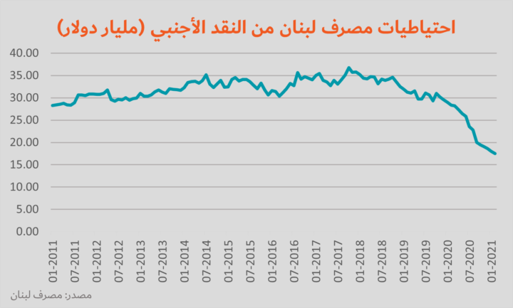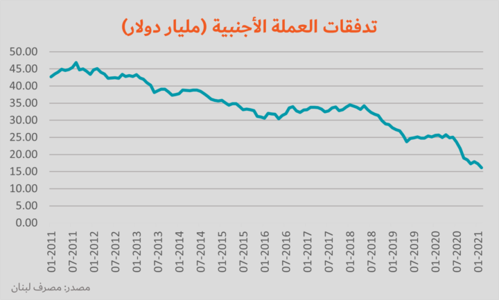أشارت الدلائل الرئيسية بالفعل، منذ عقد على الأقل، إلى تزايد الضغط على الليرة والبنوك. فقد شهد لبنان منذ فترة طويلة عجزاً مزدوجاً-في الموازنة والحساب الجاري- لكنه بدأ في مراكمة الاحتياطيات النقدية الأجنبية من تدفقات رأس المال بداية من مطلع التسعينيات. وأخذ صافي أصوله الأجنبية في الارتفاع باطرادٍ ليصل إلى 46.85 مليار دولار في آب/أغسطس 2011. لكن منذ ذلك الحين، تسببت التدفقات المنخفضة المتزامنة مع العجز المزدوج الذي يواصل ارتفاعه في أول انخفاض متواصل في صافي الأصول الأجنبية في تاريخ لبنان. ليبلغ صافي الأصول الأجنبية في لبنان 16 مليار دولار بحلول شباط/فبراير 2021، كل هذا في ظل تضاؤل احتياطيات مصرف لبنان من النقد الأجنبي.
