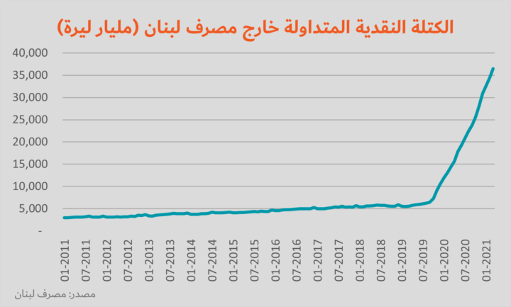 بالنسبة لكثير من اللبنانيين، كان الهبوط الذي بدأ في أيلول/سبتمبر 2019 بمثابة أول مؤشر على أن هُناك خطبٌ ما. فقد بدأت الليرة اللبنانية في التراجع عن سعر صرفها الرسمي الذي يبلغ 1,507.5 مقابل الدولار لأول مرة منذ أكثر من عقدين. وفاقم انخفاض احتياطي مصرف لبنان من العملات الأجنبية الانهيار، وأدت ثقة الناس المتردية في النظام المالي إلى سحب الودائع من البنوك وتكديس اللبنانيين للعملة النقدية وهروب رؤوس الأموال. وفي ظل عدم وجود قانون لتنظيم وضبط رؤوس الأموال، بدأت البنوك في فرض قيودها الخاصة على تحويلات العملة الأجنبية ورؤوس الأموال، وأيضاً على سحب الدولار -بل وحتى الليرة اللبنانية- وهو ما أتاح الفرصة لحدوث كافة أشكال الانتهاكات والتجاوزات. نتيجة لذلك، انخفضت احتياطيات مصرف لبنان من النقد الأجنبي (باستثناء الذهب وسندات اليوروبوند والأوراق المالية الأجنبية) بمقدار 14 مليار دولار منذ تشرين الأول/أكتوبر 2019. ومع تحول العالم إلى الاقتصاد غير النقدي، ظل لبنان يجدف في الاتجاه المعاكس: فقد تضخمت نسبة الكتلة النقدية المتداولة خارج مصرف لبنان لتصل إلى 487% منذ أيلول/سبتمبر 2019.
