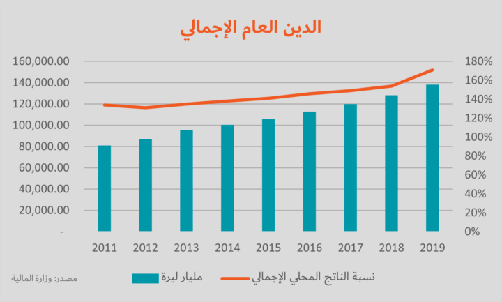 نتيجة لهذا القطاع العام المتضخم وهذه الأنشطة شبه المالية، كانت الحكومة مثقلة بتكلفة رئيسية ثالثة، وهي خدمة ديونها. فقد وصل إجمالي الدين العام إلى 144.6 تريليون ليرة لبنانية في يناير/كانون الثاني 2021، أي ضعف ما كان عليه في العام 2011، قبل عقد من الزمن. زادت خدمة الديون بنسبة 50% منذ 2011 إلى مارس/آذار 2020 عندما عجز لبنان عن سداد ديونه. انتقد كثيرون ذلك واعتبروه تخلفاً فوضوياً عن السداد، وتوقّعوا أن يقوم حاملو سندات آخرون بـ"تسريع" سداد ديونهم، ومن ثم حدوث تخلّف عن السداد في الحافِظات المصرفية اللبنانية. من المثير للدهشة أن هذا التسريع لم يحدث؛ ويقول مؤيدو القرار إنه نجح في إنقاذ لبنان من القيام بسحب المزيد من الاحتياطي الأجنبي، وحمَى المُودِعين من استخدام ودائعهم في دفع الدين الخارجي بسبب تدهور الاقتصاد.