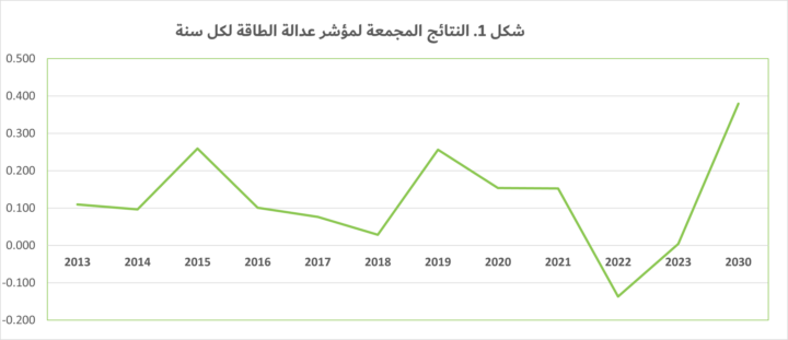 تظهر نتائج المؤشر المجمعة، الموضحة في شكل 1، تقلبات في مؤشر عدالة الطاقة، مع إظهار فترات من التحسن تعقبها فترات من الانتكاس. ففي السنة الأولى للدراسة، أيّ عام 2013، سجل مؤشر عدالة الطاقة 0.11. ثم شهد زيادة مطردة، بلغت ذروتها في عام 2019 مع تسجيل 0.256. وفي وقت لاحق، تراجع مؤشر عدالة الطاقة إلى أدنى مستوى له ليسجل -0.137، ويعزى ذلك بصفة أساسية إلى زيادة تكاليف الاشتراك في المولدات الكهربائية في لبنان. بعد ذلك، شهد المؤشر زيادة طفيفة مسجلاً 0.004 في عام 2023، لا سيما بعد انخفاض المتوسط السنوي لأسعار الاشتراكات في المولدات خلال هذه السنة.