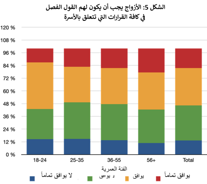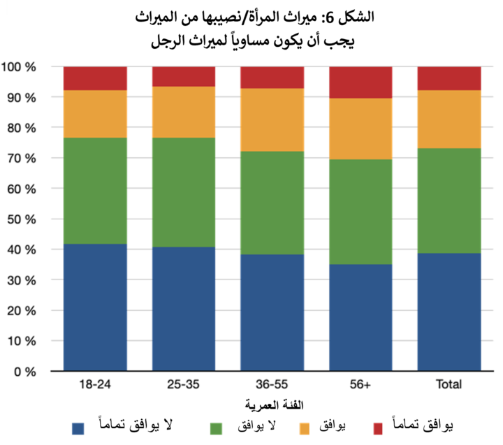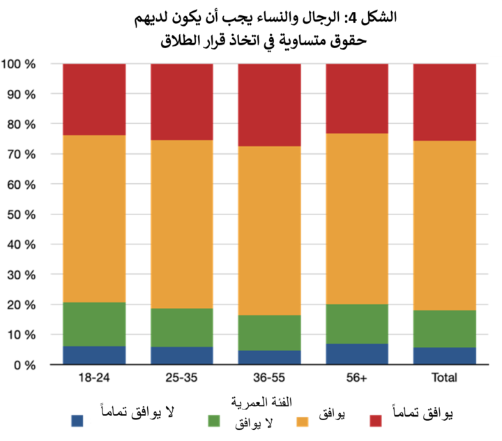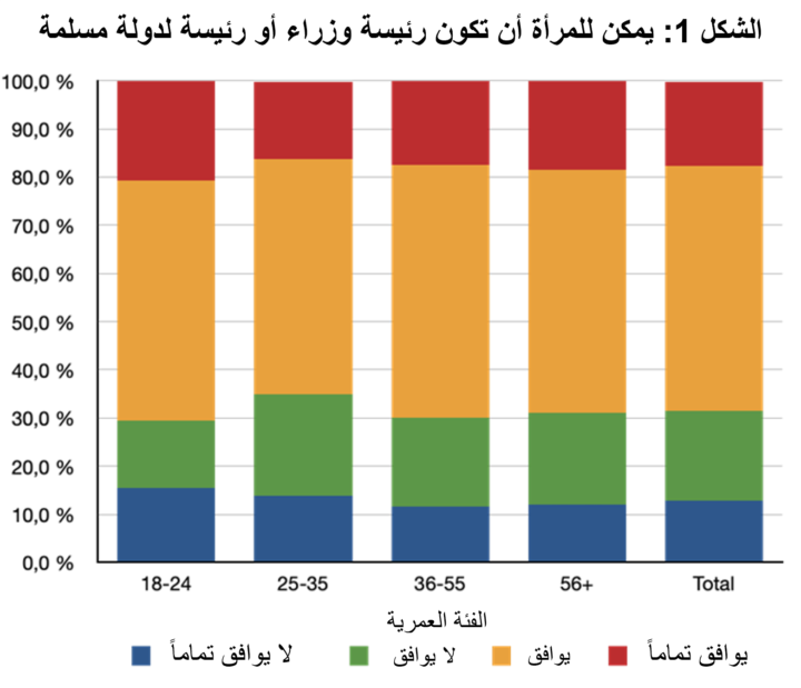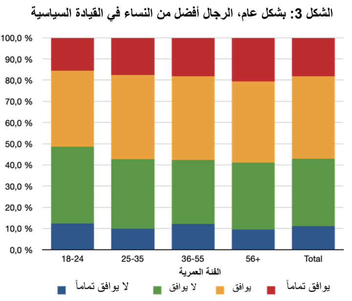 تبين الرسوم البيانية التالية إحصاءات وصفية حول دعم مختلف التأكيدات المتصلة بالمساواة بين الجنسين في مختلف الفئات العمرية استناداً إلى الدراسات الاستقصائية التي أجرتها شبكة "الباروميتر العربي". وقد استخدمت الأسئلة الثلاثة الأولى لإعداد مؤشر المجال العام، بينما استخدمت الثلاثة الأخيرة لإعداد المجال الخاص.
