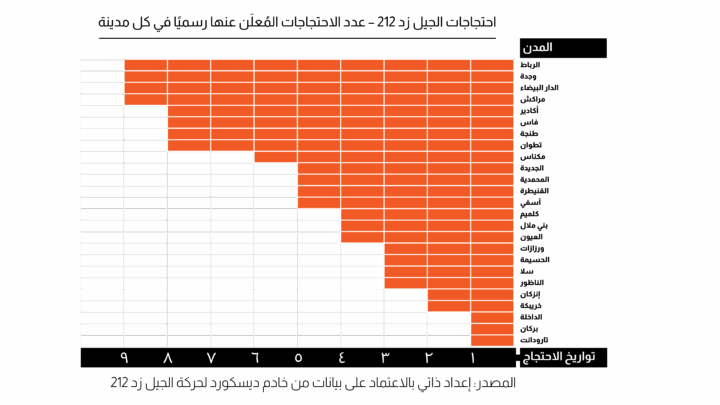 ويناقش الشباب المغاربة يوميًا حالة الحراك على منصة التراسل الفوري "ديسكورد"، ويتخذون قراراتهم بشكلٍ أفقي وتحت ستار إخفاء هويتهم.2وحتى 9 تشرين الأول/أكتوبر ، بلغ عدد أعضاء الخادم أكثر من 260.000 عضو. إلى جانب خاصية إخفاء الهوية، تتيح المنصة التواصل عبر الدردشة النصية والمكالمات الصوتية والفيديو، فضلاً عن سهولة الوصول إليها مجانًا، ما يمنحها مزايا أساسية في التنظيم والتنسيق.3New Arab, “Discord: The Launchpad for Morocco’s Gen Z 212 Protests,” 6 October 2025, The New Arab, available at https://www.newarab.com/news/discord-launchpad-moroccos-gen-z-212-protests يمكن للمواطنين الانضمام إلى القناة المخصصة لمنطقتهم للتنسيق مع المجتمعات المحلية حول أماكن التحرك وطرقه. وفي  المساحة نفسها، يمكنهم أيضًا المشاركة في نقاشات أوسع نطاقًا حول الحركة ومشاركة الوسائط والمصادر التعليمية الذاتية، وتوثيق حالات العنف للمطالبة بمحاسبة السلطات ونشر روح التضامن مع الضحايا. يجمع المشرفون على خادم "ديسكورد" نقاط التجمع اليومية للاحتجاجات ثم ينشرون إعلانات بمواقع وجداول الاحتجاجات اليومية الزمنية، ليُعاد تداولها على نطاق واسع عبر وسائل التواصل الاجتماعي الأخرى.