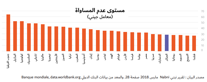 هذا وينبغي التنويه أن نظام الدعم في الجزائر على عيوبه يبقى من أكثر الأنظمة التي تصل إلى الفئات الهشة كما هو مبين في الرسم البياني الذي يمثل معامل جيني (Gini) للفوارق الاجتماعية.