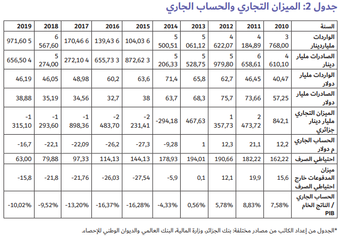 يظهر الجدول 2 العجز الذي يسجله الميزان التجاري والحساب الجاري منذ 2014 والذي يتوافق مع انهيار أسعار البترول. فرغم الانخفاض الكبير في الاستيراد من 71 مليار دولار في 2014 إلى 46 مليار دولار في 2019، إلا أن العجز بقي مستمراً.
