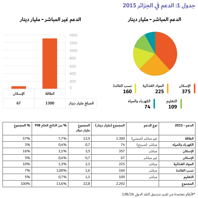 • الدعم الضمني للطاقة (الوقود والغاز والكهرباء) 1300 مليار دينار جزائري أو 7.7% من الناتج المحلي الإجمالي أو 13 مليار دولار.