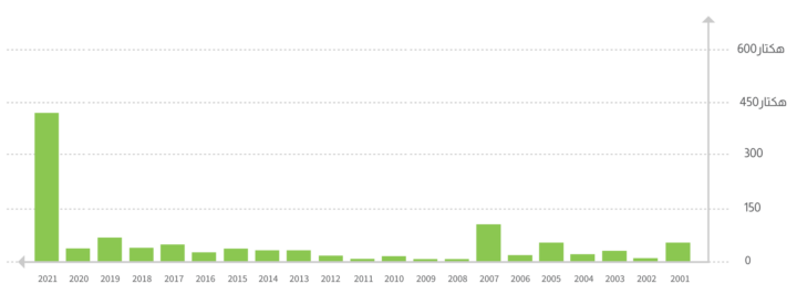 الشكل رقم 1: معدل فقدان الغطاء الحرجي في عكار، لبنان، بين عامي 2001 و 2021 ، بالهكتار (10,000 متر مربع) (المصدر: مؤسسة «غلوبال فورست واتش 2022 ،») .