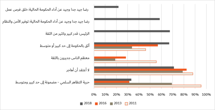 بحسب البيانات الصادرة عن شبكة "الباروميتر العربي" البحثية قبل أزمة كوفيد-19، فقد طرأ انحسار فيما يخص الحق في حرية التظاهر السلمي، وتراجعت نسبة المواطنين الذين يقولون بأن هذا الحق "مضمون بدرجة كبيرة أو متوسطة"، من أعلى مستوى له على الإطلاق بنسبة 90% عام 2011، إلى 60% عام 2013، ثم إلى 30% منذ عام 2016 وإلى الوقت الراهن. وفي الوقت نفسه، بلغت نسبة الثقة في الرئيس "بدرجة كبيرة أو كبيرة للغاية" نحو 68%، وهي أكثر من مثيلاتها في معظم دول الشرق الأوسط وشمال أفريقيا، وفقاً لآخر استطلاع أجرته شبكة "الباروميتر العربي". يُعد هذا تحسناً ملحوظاً بعد السنوات التي شهدت العديد من الاضطرابات في الفترة بين عامي 2011-2013. غير أنه يُمكن أيضاً ملاحظة تدني نسبة الثقة في الحكومة بمرور الوقت. إذاً كيف يمكن تفسير هذه البيانات التي تبدو متناقضة؟