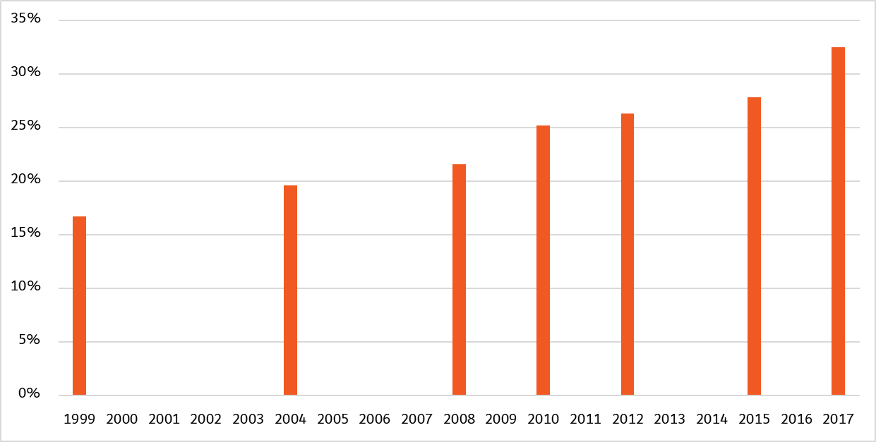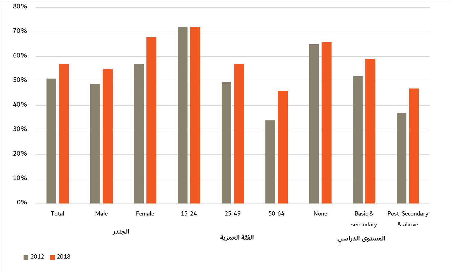 المصدر: ELMPS (1988-2018) كما حسبها م. سعيد، ر. جلال و م. سامي، "عدم المساواة وتنقل الدخل في مصر"، منتدى البحوث الاقتصادية، ورقة العمل 1368، تشرين الثاني/نوفمبر 2019.