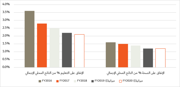 في الوقت نفسه ومع مواصلة الأجور انحدارها، استمر انخفاض الإنفاق العام على قطاعي الصحة والتعليم. وعند الرجوع إلى الإحصاءات المتاحة من منظمة الصحة العالمية وتقريرها السنوي حول مصر، سنجد أن إنفاق مصر على القطاع الصحي نسبةً من الناتج المحلي الإجمالي، قد شهد انخفاضاً حاداً، ليصل إلى 1.5% في عام 2017/2018، بعد أن كان 4.6% في عام 2016/2017، بالرغم من التزام الحكومة الدستوري بمضاعفة النسبة لتصل إلى 3% (الحد الأدنى من الإنفاق العام على الصحة الذي حدده الدستور هو %3 من الناتج القومي الإجمالي). والمبرر الرسمي المعلن هو أن مصر لا تتمتع بالحيز المالي الذي يسمح لها بإنفاق المزيد على قطاعي الصحة والتعليم. لكن بما أن الحكومة قد خصصت المليارات، أو اقترضتها، لإنفاقها على مشاريع عملاقة، فإن هذا يثير تساؤلات حول ما إذا كانت المشكلة تكمن في الحيز المالي أم أنها مسألة أولويات وإرادة سياسية. وقد أدى الإنفاق الاجتماعي المنخفض إلى الحد من الحراك الاجتماعي، مع لجوء الأغنياء إلى خدمات القطاع الخاص، بينما يعلق الفقراء مع الخدمات المنخفضة الجودة.