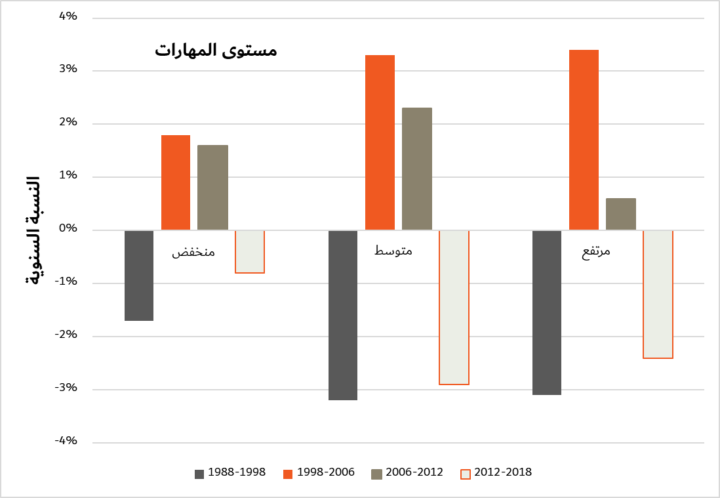 الشكل 6: متوسط نمو الأجور الحقيقية لكل فترة، وبمستويات المهارة
