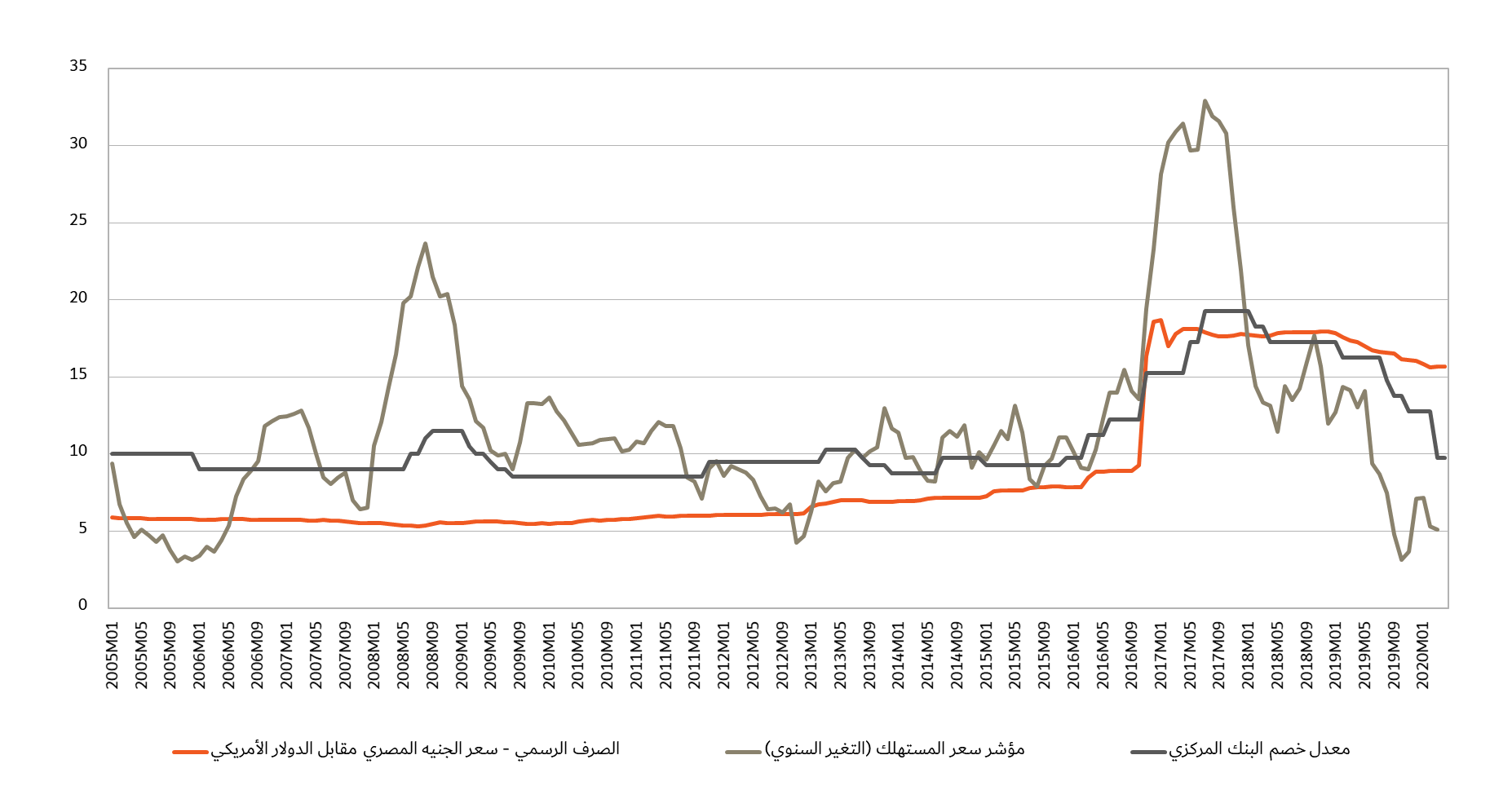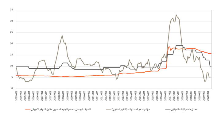 المصدر: صندوق النقد الدولي لمؤشر سعر المستهلك والبنك المركزي المصري لسعر الخصم وسعر الصرف