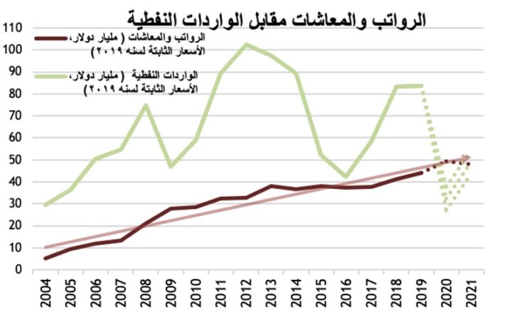 وقد أدى ذلك، مدفوعاً بارتفاع أسعار النفط، إلى توسّع هائل في عدد موظّفي القطاع العام الذي زادت نفقاته خمسة أضعاف تقريباً من عام 2005 إلى ما يقدر بنحو 50 مليار دولار في عام 2020 (الخط الأحمر في الشكل 1).
