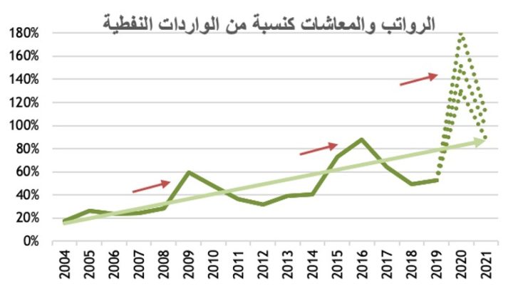 كانت هذه النفقات تزداد باستمرار ولم تتوقف إلا حينما كانت عائدات النفط تتراجع أثناء الأزمات، لكنها كان تستأنف اتجاهها التصاعدي مع تجاوز الأزمات. وفي هذه العملية، استهلكت النفقات نسبة مئوية متزايدة باضطراد من عائدات النفط - وهي حصة ارتفعت بشكل متتابع وغير مستدام خلال كل أزمة مع انخفاض عائدات النفط (الأسهم الحمراء في الشكل 2).