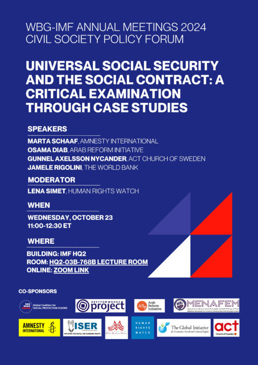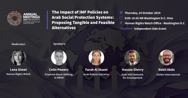 Amid ongoing conflicts in the Arab region and the exponential increase in humanitarian needs, effective and inclusive social protection systems have become more imperative than ever. However, the current global financial architecture remains a significant impediment to shifting towards such systems and achieving universal social security. In light of this, on the occasion of the 2024 Annual Meetings of the IMF and WBG in Washington, D.C., from October 21-26, the Arab Reform Initiative (ARI) is launching an advocacy campaign. The campaign will include the release of two new regional reports on the role of the International Financial Institutions (IFIs) in shaping social protection systems in the region, as well as an independent side event and four sessions at the Meetings’ Civil Society Policy Forum (CSPF). These events aim to provide a platform to share ARI and its partners’ latest research findings and to advocate for the resulting policy recommendations with IMF and WBG representatives.