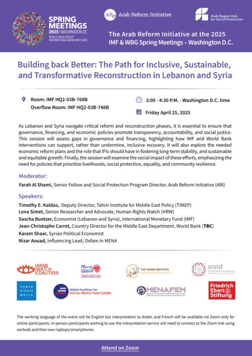 Session's Abstract: As Lebanon and Syria navigate critical reform and reconstruction phases, it is essential to ensure that governance, financing, and economic policies promote transparency, accountability, and social justice. This session will assess gaps in governance and financing, highlighting how IMF and World Bank interventions can support, rather than undermine, inclusive recovery. It will also explore the needed economic reform plans and the role that IFIs should have in fostering long-term stability, and sustainable and equitable growth. Finally, the session will examine the social impact of these efforts, emphasizing the need for policies that prioritize livelihoods, social protection, equality, and community resilience.