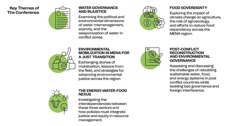 Over the years, the Annual Conference on Environmental Politics has facilitated meaningful exchanges among diverse stakeholders, creating opportunities for in-depth discussions on environmental governance, equitable resource management, policy reforms and grassroots mobilization: the inaugural conference in 2021 laid the foundation for the approach we have taken since, and in subsequent conferences (in 2022, in January 2023, in May 2023, and March 2024) we further explored how concepts and notions of just environmental transition resonated in our particular contexts and societies. The 2025 edition will focus in particular on food and water justice, two of the most critical challenges influencing sustainability and equity in the MENA region.  This year’s discussions will bridge perspectives from North African countries which are navigating complex transitions in water governance, food sovereignty and agricultural sustainability, with other parts of the region that are reeling from the impact of years of conflict, economic crisis, occupation and instability.