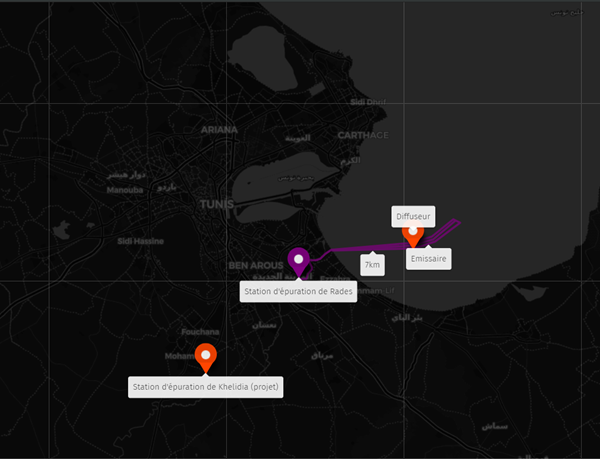 Actuellement, 95000 m3 par jour d’eau usées sont traités dans la banlieue sud. Une partie importante de cette eau non-conforme aux normes tunisiennes dont la NT.10602, relative aux rejets d'effluents dans le milieu hydrique, est rejetée directement dans la mer à plusieurs endroits (voir carte).