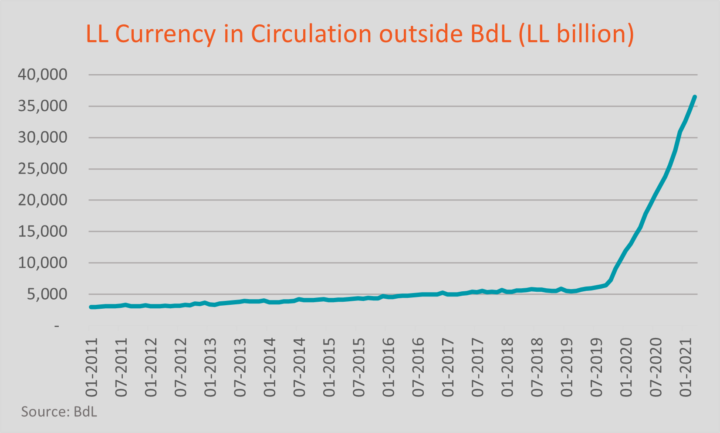 The depreciation that began in September 2019 was, for many Lebanese, the first indicator that something was broken. The Lebanese lira (LL) began to depreciate from its official rate of 1,507.5 to the dollar for the first time in more than two decades. The drawdown on foreign currency reserves at the BdL worsened the collapse and the public’s deteriorating trust in the financial system led to bank runs, currency hoarding and capital flight. In the absence of a capital controls law, banks began imposing their own restrictions on foreign currency and capital transfers, as well as limits on withdrawals of USD or even LL, keeping the door open to all sort of abuses. As a result, BdL’s foreign currencies reserves (excluding Gold, Eurobonds and Foreign Securities) decreased by USD 14 billion2As of February 2021; Banque Du Liban figures since October 2019. As the world shifted towards a cashless economy, Lebanon was spinning off in the opposite direction: currency in circulation outside the central bank increased by 487% since September 2019.