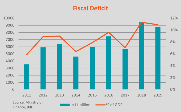 First, Lebanon has a dangerously bloated public sector. For the last 27 years, more than two-thirds of government spending has been allocated to current spending. The top costs have consistently included the growing public sector, ballooned by unregulated appointments to feed political patronage networks – including ghost workers – and costly public projects riven with kickbacks. This created an inefficient, wasteful, and unproductive public sector. The problem has worsened since 2017, when parliament approved an increase to public sector wages just months ahead of key parliamentary elections. Lebanon’s recurrent budget deficit grew exponentially and uncontrollably since then, with public spending on personnel costs swelling from 30% of the 2017 state budget to 50% in 2020. Another major drain on the budget was the state-owned electricity provider, Electricité du Liban (EdL), a highly inefficient sector that is inflicting a significant economic and social cost. Over the last decade, the Lebanese government transferred more than USD15 billion4Author’s calculations, according to Ministry of Finance statements to EdL, amounting to an average of 42% of the fiscal deficit over the same period. These costs contributed to an overall rise in the fiscal deficit, which exceeded 11% of GDP in 2019, the last year for which government figures are available.