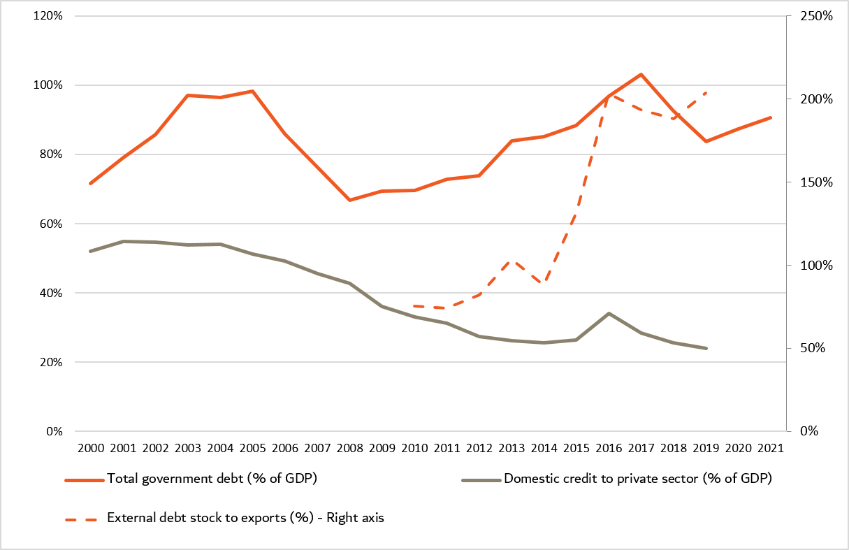 The causes of the low level of private investment continue to be hotly debated. 9See, for example, El-Haddad, Amirah. "Redefining the social contract in the wake of the Arab Spring: The experiences of Egypt, Morocco and Tunisia." World Development 127 (2020): 104774; and Diwan, Ishac, Philip Keefer, and Marc Schiffbauer. "The Mechanics, Growth Implications, and Political Economy of Crony Capitalism in Egypt." Crony Capitalism in the Middle East: Business and Politics from Liberalization to the Arab Spring (2019): 67. Several possible causes have been noted. A first hypothesis relates to the crowding out of finance by the public sector that reduces access of private firms to capital. Pre-2011, credit to the private sector was around 20% GDP, already one of the lowest such ratio in the Middle East (for example, around 100% GDP in Tunisia, Jordan, and Lebanon). By 2015, it had fallen to 14% GDP, and in subsequent years, it fell as low as 7.5% GDP, before starting to recover. The goal has been to raise it gradually back to 20% by 2020. On the surface, low access can be explained by the redirection of credit towards financing the government deficit. But this explanation is not totally convincing, as financial crowding out was always a factor in Egypt.