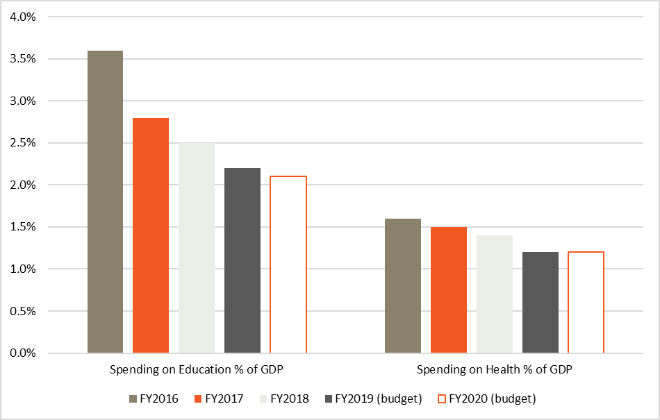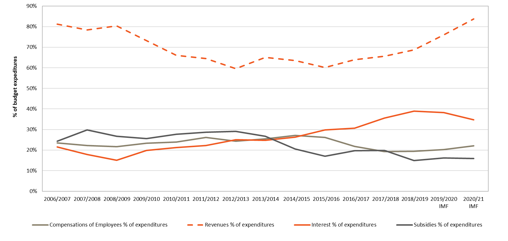 Between 2015 and 2019, the budget deficit also fell, from 12.5% GDP to 6.7% (with the primary deficit swinging from -3.3% to a surplus of +2.2% GDP). Budget cuts of this magnitude (nearly 6% GDP) are not easy to implement, as they create political dilemmas that must be managed. Between 2013-15, Sisi, first as de facto ruler and later as president, resisted budget cuts (and devaluation) in order to stabilize his rule, but this ultimately made the 2016 adjustment larger and more abrupt. The 2016 programme ended up cutting deeply into subsidies – they fell over the last four years from 4.1% to 1.2% of GDP. At the same time, the public sector wage bill was squeezed from 8% to 5% GDP. Public expenditures on health and education also fell, and stood at a meagre 4.5% GDP in the 2019 budget. These were meant to be squeezed further to 3.3% GDP in the 2020 budget. Subsidies and social protection, which stood at over 7% GDP before the IMF programme are down to about 4% GDP, with less than 1% GDP now targeted at the poor. On the other hand, tax revenues remained stagnant, despite the introduction of a VAT, rising marginally from 13 to 14% GDP.8To continue the comparison with the 1991 reform, the fiscal adjustment then was dubbed "stealth reforms", as they proceeded very gradually, such as by shrinking the size of bread rather than increasing its price. In fact, Mubarak spent his whole presidency gradually reducing expenditures - they were at 65% of GDP when he took over in 1981, and they fell gradually under his reign to 25% GDP by the early 2000s.