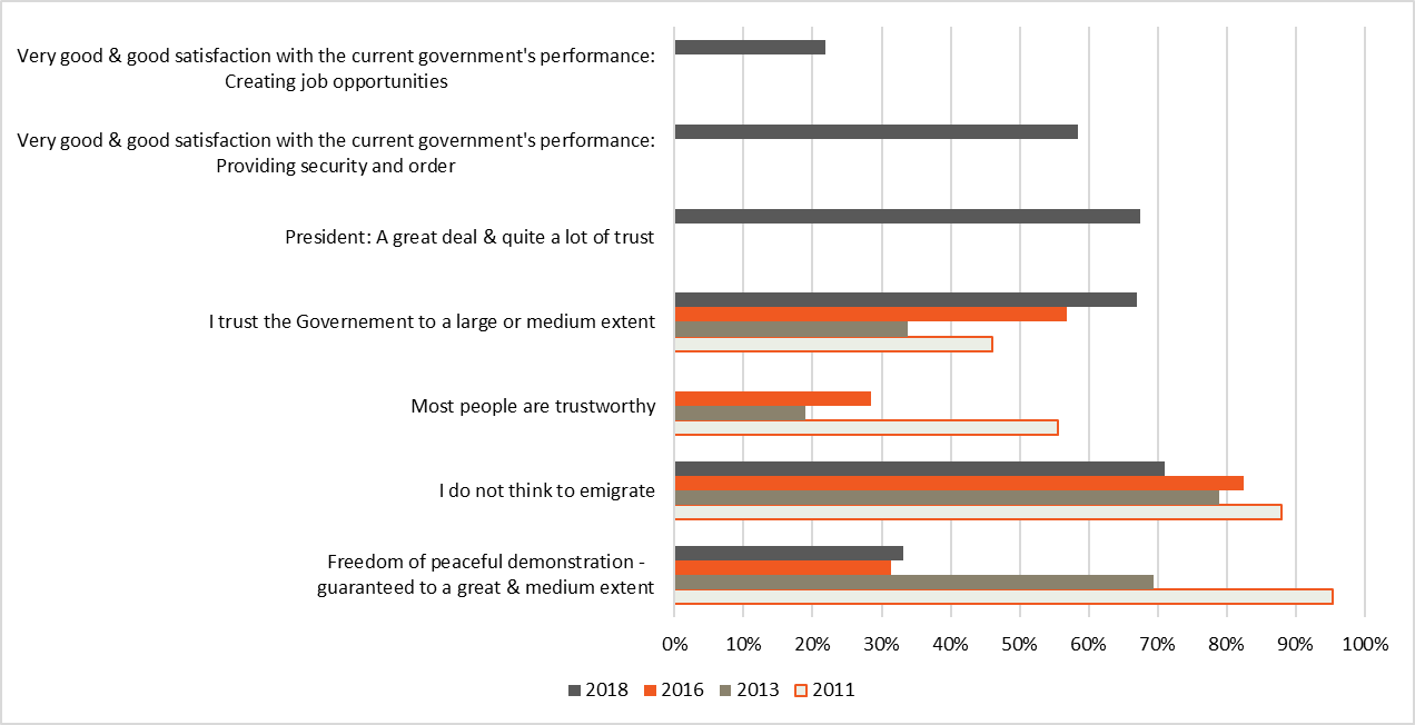So far, therefore, it seems that personal security still trumps economic security, but that this is eroding. So, how long can this last? At the same time, social tensions can be seen in the collapse of social trust. When asked if other people can be trusted, only 30% responded yes in 2019 as opposed to 55% in 2011 ("Most people can be trusted"). While 10% were considering emigration in 2011, the figure has jumped to a significant 30% in the latest wave. These figures point to a catch-22 situation.  Any easing of the police state before easing the social tensions from economic hardship can destabilize the system, but any further measures to crush dissent feeds into more economic hardships and as a result more built-up resentment.36Adly, Amr, 2016, “Egypt’s Regime Faces An Authoritarian Catch-22,” carnegieendowment.org