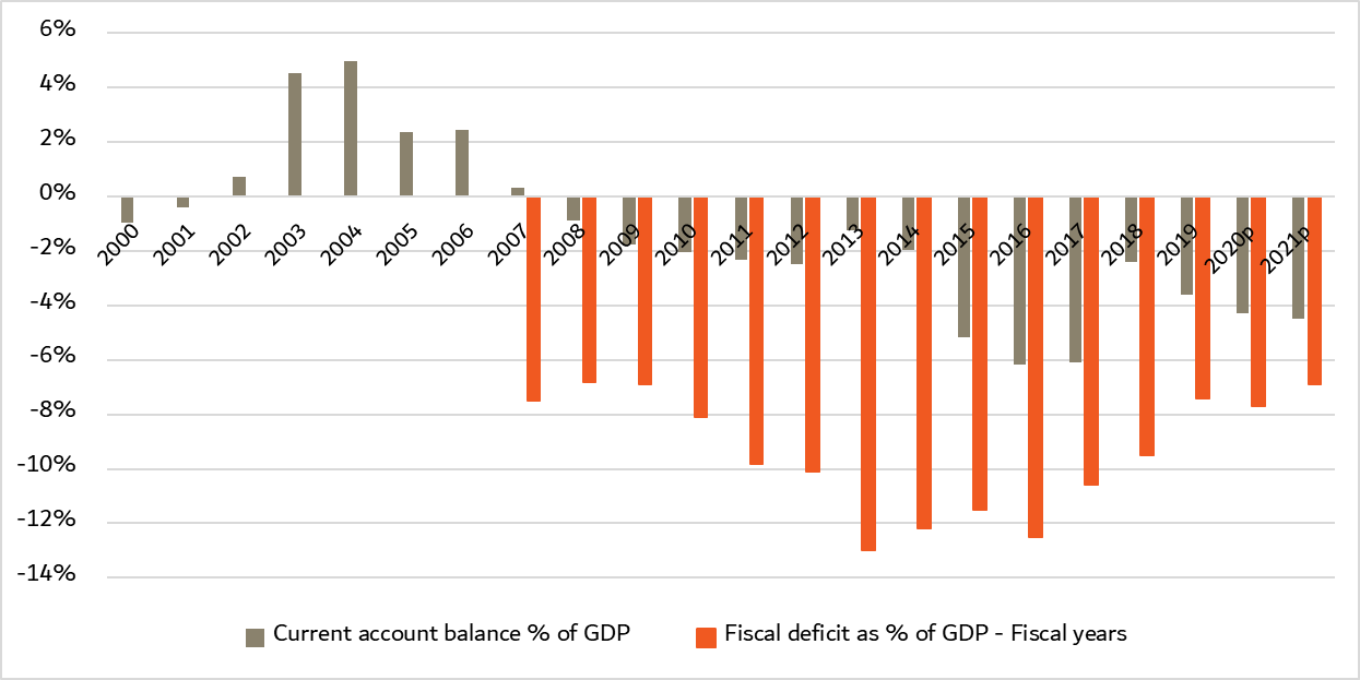By some accounts, Egypt's macroeconomic stabilization, in the context of a $12n IMF Extended Fund Facility programme during 2016-19, was a success. In any case, it was necessary. The programme followed the 2013-15 period where Egypt was largely stabilized through support from the GCC ($23bn between 2012-15). This support however largely ended up subsidizing consumption by plugging the FX hole but did not push the government to take measures to reduce the internal and external imbalances. In contrast, the IMF required, as a pre-board condition, that the Egyptian Pound be devalued by 50%, which while extremely painful socially did manage to reduce the external deficit. The real success of stabilization, however, should be judged by its ability to reduce the chronic internal and external imbalances in a sustainable way. The important question is whether this was achieved.