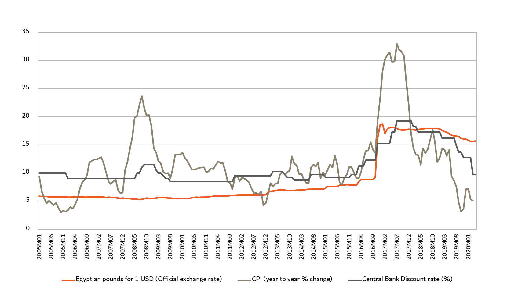 Source: IMF for CPI and Central Bank of Egypt for discount rate and exchange rate.