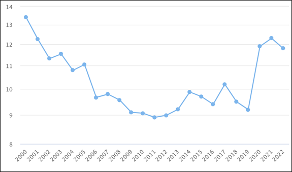 Figure 1: Unemployment rates in Morocco among the active population between 1999 and 2022.