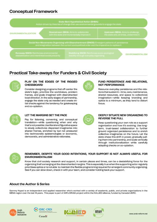 To address these questions, I propose a conceptual framework contrasting state-bent hypothetical actions (SBHA), which translates to “swimming” in Arabic, and social non-movements organizing with disenchantment (SNOD), which translates to “lean” in Arabic. ‘SBHA’ implies submersion in the state’s prosaic logic, irrespective of whether an actor is for or against the state or the current order it reinforces. When submersed, swimming becomes imperative, and the movement symbolizes the perpetual enactment of changemaking hypotheses (i.e., initiatives with theories of change that use causal logic to pursue desired outcomes). ‘SNOD’ refers to an emergent pattern of leaning on each other and the environment—and the environment and others leaning back—to enable the mutual persistence of all. Persistence through this circular leaning, or interdependence, breaks causal superiority (i.e., this leads to that) and undermines the relevance of the state and its prosaic logic.