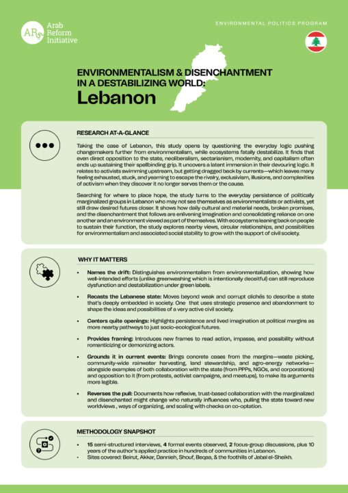 This study interrogates environmentalism as a concept and contemporary practice in Lebanon by tracing how actors are positioned in relation to the Lebanese state when navigating changemaking, abandonment, and the imperative of persistence. It understands environmentalism as emerging from socio‑ecological transformation and as fundamentally different from environmentalization, which arises from reproductions within the current order—namely today’s variations of neoliberal capitalism and the prevailing everyday mindset treating it as the most reasonable way to live. Lebanon’s current order is organized around a sectarian form of aggressive neoliberal capitalism—marked by puzzling tendencies such as championing free markets while selectively shaping them to serve entrenched power. The study highlights how prefigurative politics—the enactment of desired futures by meeting everyday material needs for persistence—is emerging from Lebanon’s political margins and can give way to environmentalism.