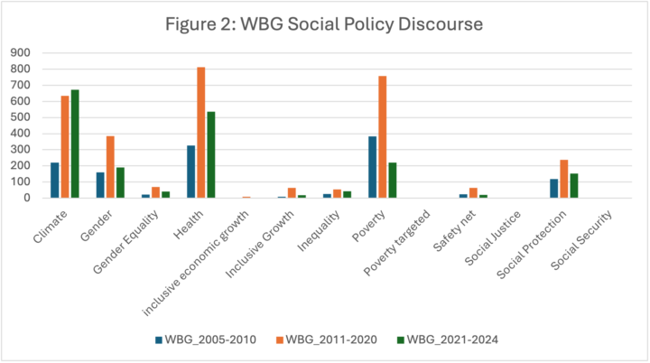 This paper pays particular attention to the IMF and World Bank’s discourse on social policy, specifically their framing of social protection. The discourse analysis, supported by the word frequency results, shows a clear increase in the use of the term “social protection” in IMF and World Bank documents over the past two decades. In the IMF dataset, the term is absent during 1993–1998, appears modestly in 2005–2010 with three mentions, and rises to 32 mentions in 2011–2020. For the World Bank, “social protection” registers 119 mentions in 2005–2010 and 237 mentions in 2011–2020. Also, across these two decades, the World Bank consistently maintains higher numeric levels than the IMF.