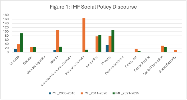 Several studies have been undertaken that explicitly aim to investigate the nature of discursive change and test its impact on social policy within the IMF and World Bank. In their study, Kaya and Reay (2019) examine the evolution of discourse related to the Washington Consensus within the IMF by conducting a content analysis of approximately 1,200 IMF documents from 1982 to 2011. They identified a set of market-oriented policy instruments associated with the Washington Consensus, along with another set of “socially oriented, market-moderating” dimensions, reflecting what Rodrik (2006) termed the shift toward an “augmented consensus”, defined as an evolved form of the Washington Consensus that adds social and institutional reforms to market-oriented policies. Their study demonstrates that this shift was intrinsically fragmented and significantly influenced by the criticism the IMF faced following the failure of consensus-driven policies in various countries during the 1980s and 1990s (e.g., Mexico, East Asia, Brazil, Russia, and developments in Africa after the 1980s loan programs). Despite the supposed re-emphasis on social development, the “augmented consensus” still included market-oriented elements such as labor market liberalization, independent central banking, and capital account liberalization. This suggests that, even as the IMF adopted a discourse more open to socially oriented, market-moderating approaches, it simultaneously reframed core consensus instruments while maintaining their central role in policy design. Change was thus limited to the introduction of new instruments within the same overarching economic framework, maintaining the view of social policy primarily as an economic tool. Similarly, Vetterlein (2015) examines the evolution of development discourse and social policy language within both the IMF and World Bank. Vetterlein concludes that although this language has significantly evolved over time, "the underlying assumptions guiding policy development have remained stable”. Rather than adopting a counter-discourse that lays the foundation for a more holistic development approach, the overall strategy has remained rooted in an econocentric framework. The study also shows that the emerging discourse around “partnership” and “ownership” serves as a strategic tool to shift responsibility for policy failures onto states, thereby serving as a legitimizing strategy for both institutions. These findings are corroborated in Farnworth and Irving’s (2014) discourse analysis of the speeches of the six previous IMF managing directors covering the period between 1987 and 2014. Their study confirms that even though the IMF has incorporated inclusive growth into its discourse more prominently since the 2008 financial crisis, this shift remains superficial, and economic growth in its traditional neoliberal dimension remains a priority. As they argue, authentic commitment to inclusive growth requires a deeper commitment to comprehensive social policy and a move away from the instrumental approach that “relegates social policy to market-correction measures in support of economic objectives”.