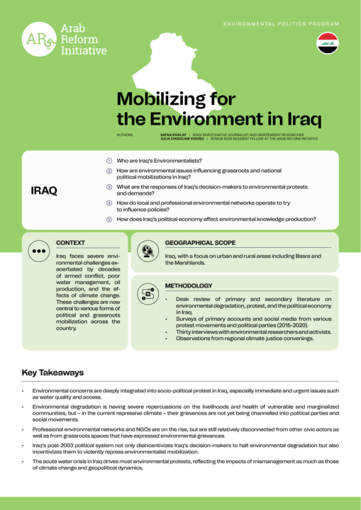When we think of environmentalism and environmental mobilization, the actions and identities that naturally come to mind are the activism and advocacy efforts of civic actors who self-define as environmental activists, climate activists, or human rights activists concerned with the environment. In a previous study published by the Arab Reform Initiative, Safaa Khalaf delves into the history and current landscape of this type of environmental mobilization, mapping the work of Iraqi civic actors who are organized into professional networks and NGOs.