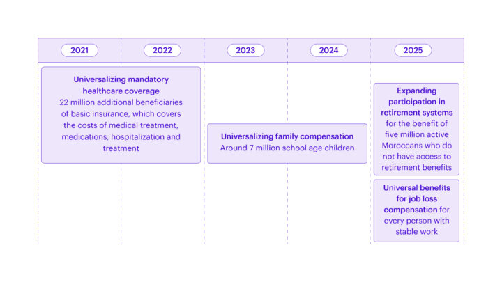 The advent of the COVID-19 pandemic exacerbated the existing economic and social vulnerabilities prevalent in Moroccan society. The pandemic exposed the inadequacies and fragility of the programs in safeguarding the dignity of the populace, which became particularly pronounced in the absence of a fair and robust social protection system. This reality led both the king and the political establishment to recognize the urgency of re-evaluating the fundamental underpinnings of this system. Their shared view materialized in a commitment to universal social protection for all Moroccans, with a deadline set for 2025.