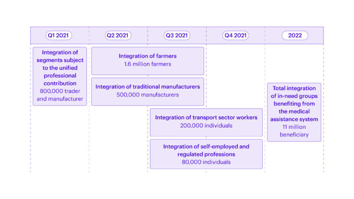 Figure 1: The timetable for universal healthcare in Morocco12Source: Presentation by the Minister of Economy, Finance and Administration Reform to parliament, to introduce the draft Law Framework No. 09.21 on Social Protection - 2021 presentation (Arabic). Available at https://www.finances.gov.ma/Publication/cabinet/2021/Expose_M.%20Ministre_Parlement.pdf (Presentation of Minister of Economy, 22 February 2021 )