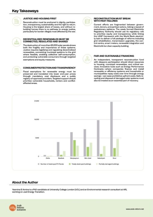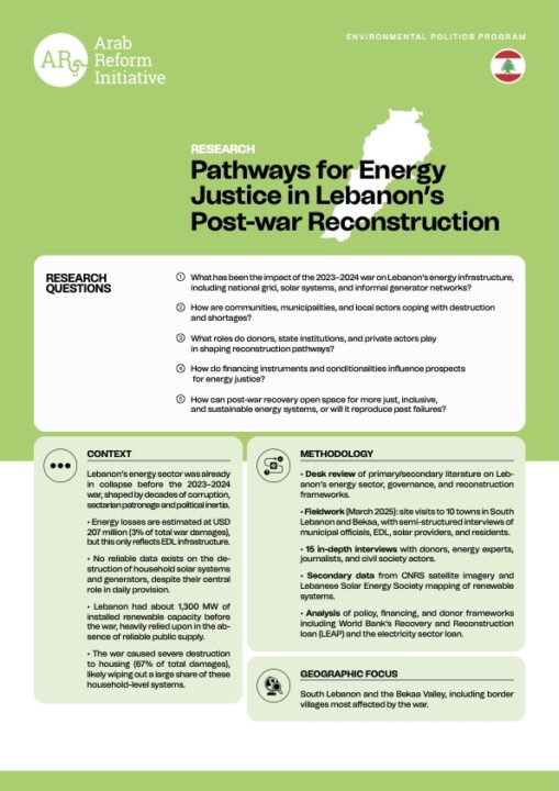 This report also engages in a critical analysis of existing policy and regulatory frameworks to identify structural gaps, implementation barriers, and opportunities for reform. In parallel, it examines donor strategies and international recovery frameworks, with a focus on how financing instruments, conditionalities, and reconstruction priorities are shaping the postwar energy agenda. By integrating these dimensions, the study not only assesses the material impacts of the war on Lebanon’s energy sector but also interrogates the political, financial, and institutional dynamics that will influence reconstruction outcomes and the sector’s recovery. Ultimately, it seeks to provide evidence-based, justice-oriented policy recommendations to support a more equitable, resilient, and sustainable energy future.