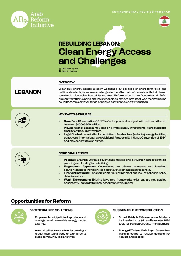 The Arab Reform Initiative held a closed roundtable discussion on 19 December 2024, titled “Post-War Access to Clean Electricity and Energy in Lebanon: Unlocking the Challenges”. The discussion focused on reconstructing the energy and electricity sector. The roundtable discussion aimed to move away from technical solutions and center the political options for post-war energy and electricity reconstruction for a more just reconstruction process.