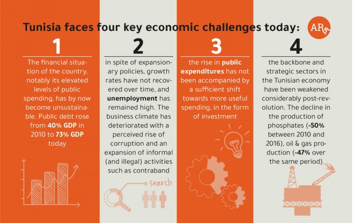 The Tunisian economy is not in good shape. It had been hit early on after the 2011 revolution by several negative shocks, including a collapse in tourism (especially after the rising insecurity of 2012-13, and the terrorist attacks of 2015-16), the loss of the Libyan market, and a fall in the production of phosphates and oil, due to badly managed work-related disputes in state-owned enterprises. Moustapha Nabli evaluates these losses at 6% of GDP lost per year on average compared to 2010, and 14% of GDP lost relative to the GDP trend that existed in 2010.