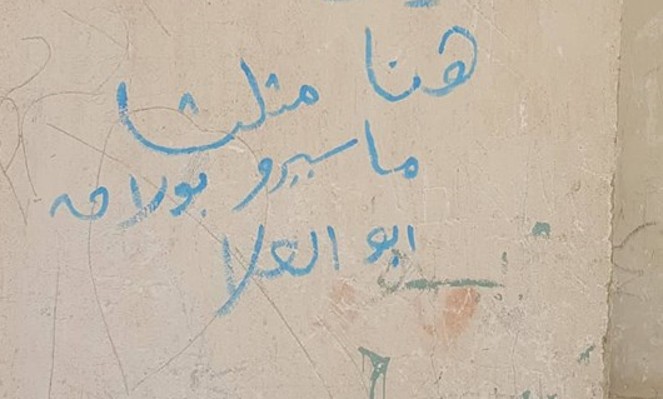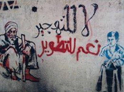 The Maspero Triangle residents were inspired by the myriad of graffiti campaigns taking place around downtown Cairo that asserted the right to the city and helped spread political messages. Thus, shortly after the revolution, the Maspero youth alliance, together with graffiti artists, activists and the people of Maspero initiated a graffiti campaign writing on the walls of their neighbourhood and inscribing their slogan “yes to development, no to forced evictions”. The use of graffiti has been a way through which the alliance can spread their message in a participatory manner with the people of the neighbourhood. Their powerful slogan shows their clear position for the development of the area and demystifies the notion that they are against the development project. However, they assert what they have repeatedly mentioned to me in several conversations; any development project should be centred around the inhabitants of the neighbourhood and work for the local community not against it. They understand and propagate that they should be at the forefronts of these development project not victimised by them. The use of graffiti is only one of many ways through which we can see the revolution in the neighbourhood, drawing upon practices that were used in the revolution and appropriating them to serve their cause. In many cases, local communities believe that their struggle is part of the revolutionary struggle and should not be side-lined or seen as the demands of the few (metaled fea’awya). Interestingly, in Asmarat the people from Maspero continued writing on walls. They are unable to organise graffiti campaigns because the municipality will not allow it, but they still write illegally announcing their presence and trying to claim the walls of their new neighbourhood.